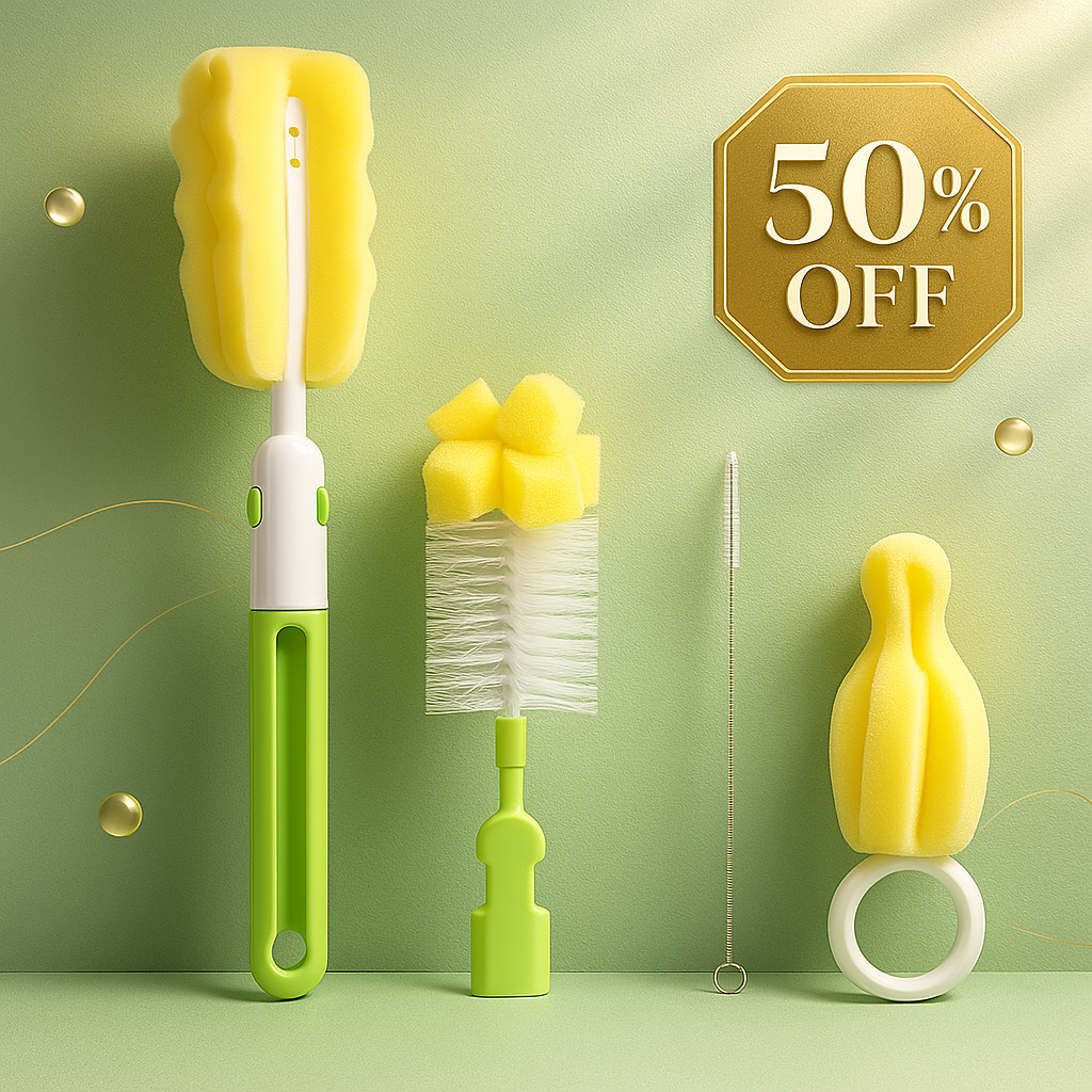 Make cleaning baby feeding essentials quick, easy, and safe with this 4-in-1 Baby Bottle & Teat Brush Set. Designed for busy parents, this kit includes interchangeable heads for bottles, teats, pacifiers, straws, and even cups — giving you everything you need in one convenient set. The soft, baby-safe bristles ensure a scratch-free clean for delicate surfaces, while the ergonomic handle gives you a comfortable grip for effortless scrubbing. Crafted from BPA-free, food-grade materials, it’s completely safe for your baby’s items.